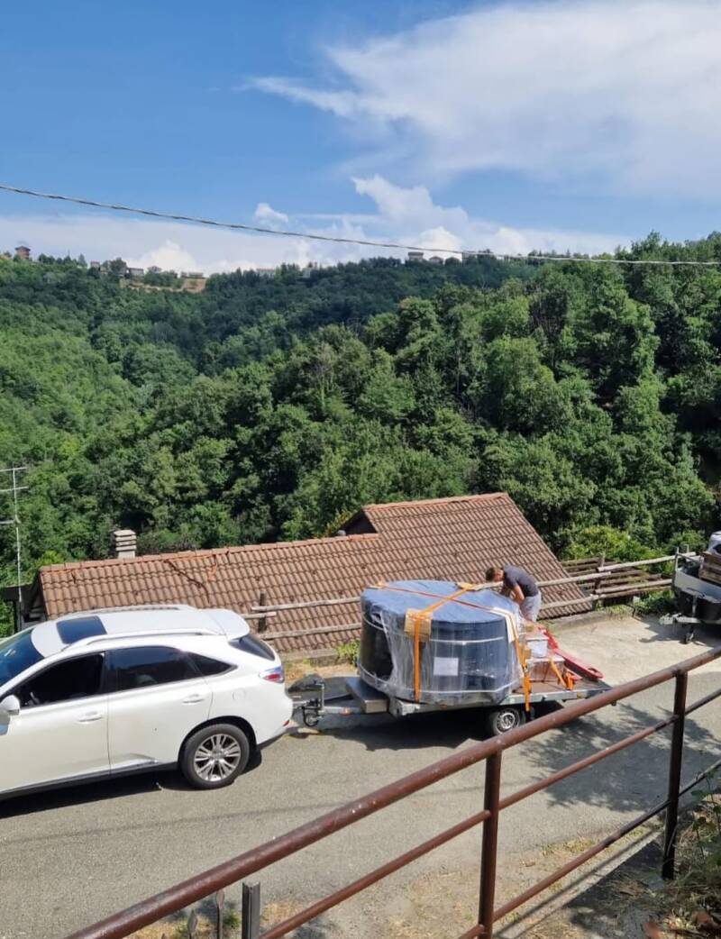 De echte uitdaging? De hottub op z’n plek krijgen! De vrachtwagen kon nét niet helemaal tot aan de woning komen, dus kwamen spontaan de buurmannen helpen duwen, tillen en aanwijzingen geven. Piano, piano... Binnen no-time stond heel Mombaruzzo te kijken hoe "de badkuip" het dorp in werd gereden. Een moment om niet snel te vergeten!